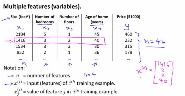 首先,举例说明了多特征值(多变量)的情况。在下图的例子中,$x_1,x_2,x_3,x_4$都是输入的变量,因为变量个数大于一,所以也称为多变量的情况。