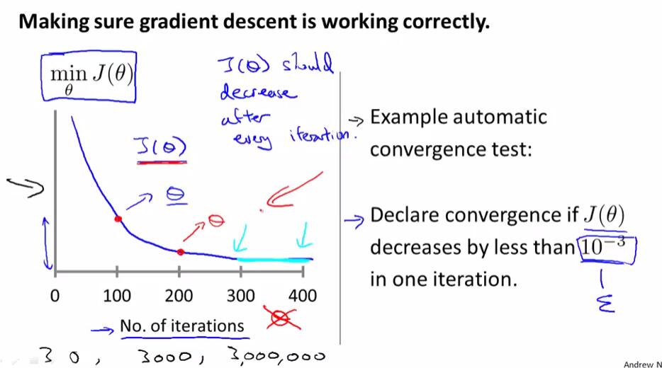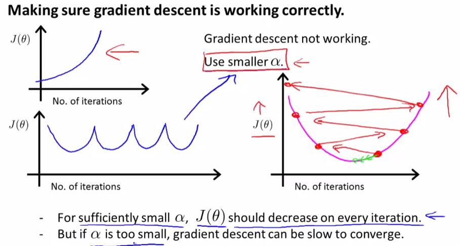 我们可以依靠自动收敛测试来判断是否正确收敛,但通常我们很难确定其临界值,因此实际中更多是使用$J(\theta)$关于迭代次数的函数图像来判断的。