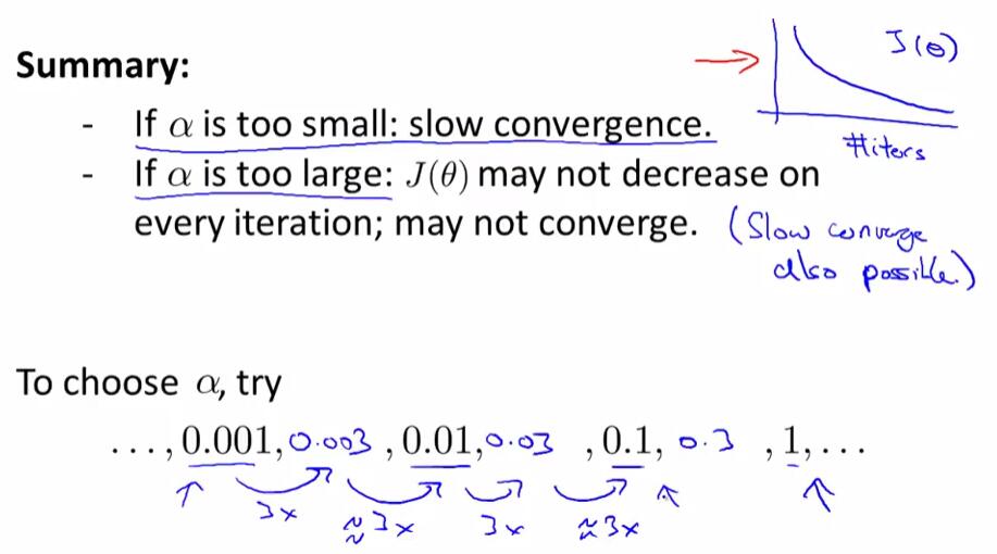 在选择学习速率时,我们一般以约3倍递增的形式,寻找能够正确收敛并且速度不会太慢的学习速率,使之尽可能快且正确地收敛。