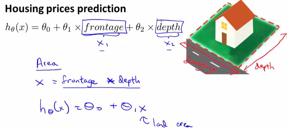 有时候,我们可以通过定义一个新的特征来优化模型,例如在房价预测模型中,定义一个新的$Area$使得$Area=frontage*depth$来优化模型。