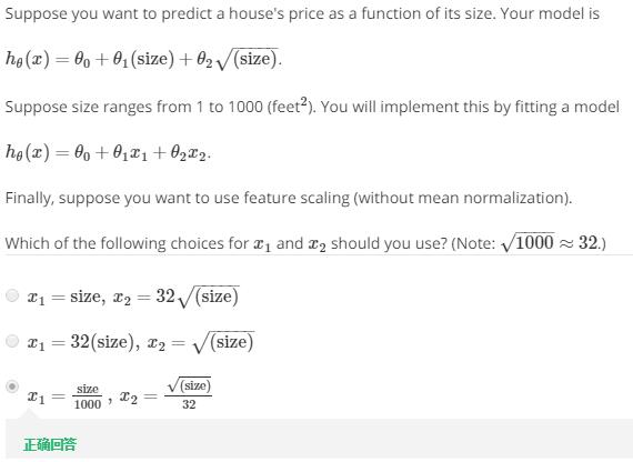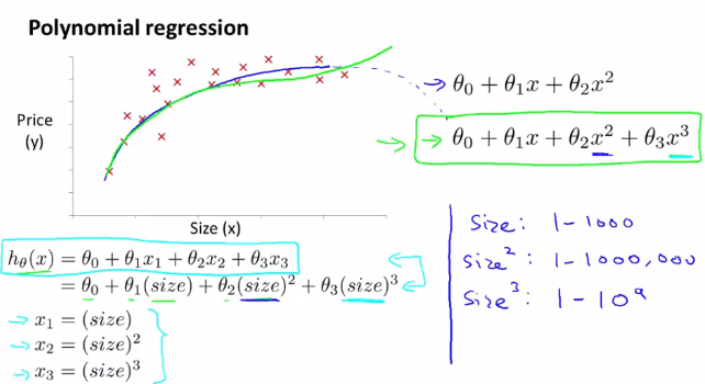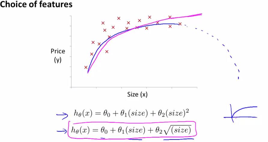 例如在对房价数据的分析中,如果选择二次模型作为假设,二次函数最后会下降,但实际中房价不会随着房子面积的增长而下降,因此二次模型不是一个理想的模型。于是引入以下的模型: