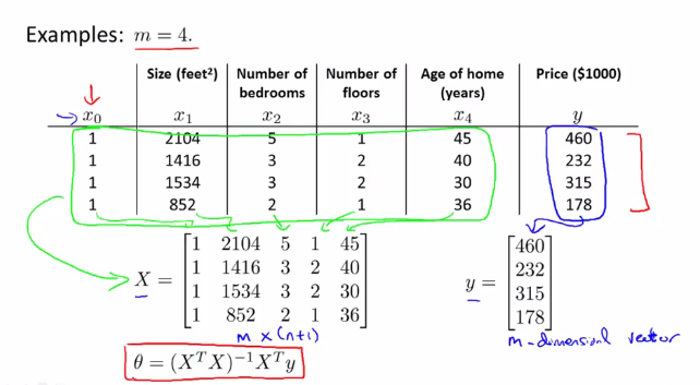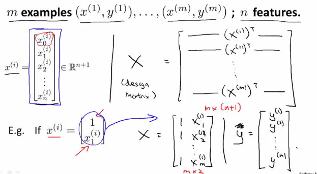 在训练集中加上一列对应特征变量$x_0$,然后构造矩阵$X,y$,然后得出使得$J(\theta)$最小的$\theta$: