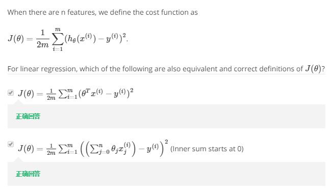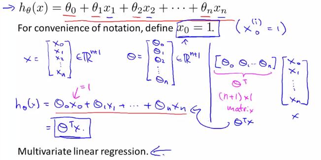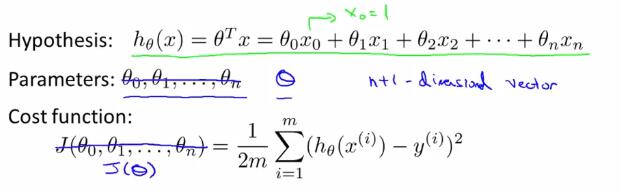 在以上的假设形式中,我们把$\theta$看成是一个$n+1$维的向量,把$J$看成是一个带有$n+1$维向量的函数。
