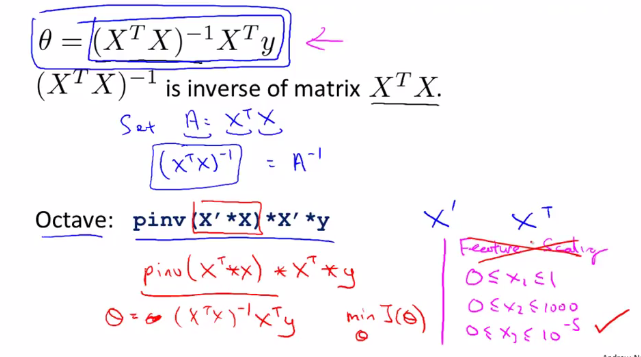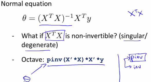 利用pinv可以计算出$\theta$的值,即使$(X’X)$是不可逆的。