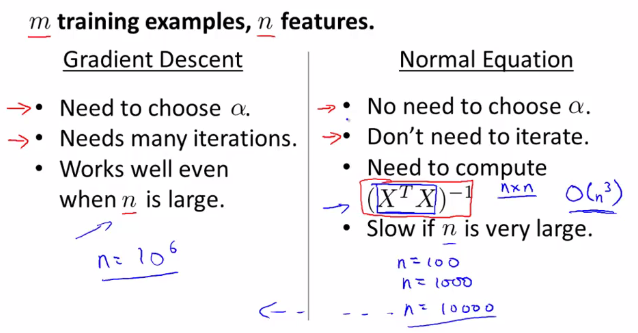 下面介绍了梯度下降法与正规方程法各自的优劣及适用范围: