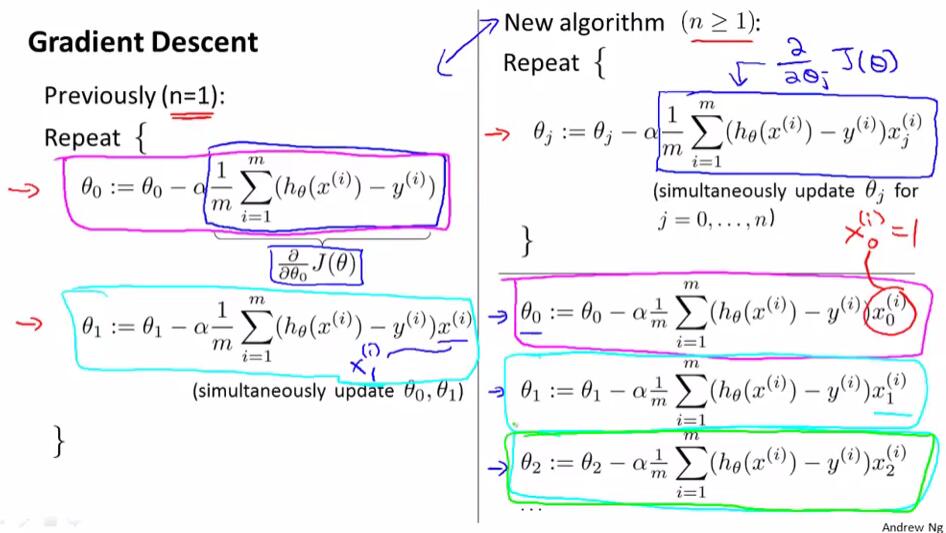 将单变量与多变量线性回归中的梯度下降法作出比较: