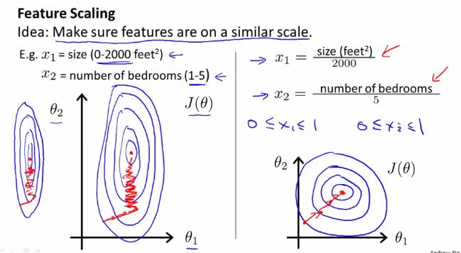 如果不同变量之间的取值范围差别较大,使用梯度下降法时可能会花费较长时间、反复来回震荡。面对这种由于不同变量之间取值范围差别较大的所导致的问题,我们引入特征缩放(feature scaling)的方法来解决。