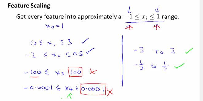 特征缩放(feature scaling) 使得数据特征调整到一定的范围内,比如[-1,1]之间。当然,这只是要求数据特征调整到一个大概的范围,具体实现的时候只要差不多即可,不一定要完全符合[-1,1]的范围。例如以下几种,就分别是正确或错误的特征缩放范围: