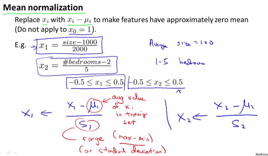 均值归一化(Mean normalization)处理:用$\frac{x_i-\mu_{i}}{\sigma}$取代$x_i$,或是简便地用$\frac{x_i-\mu_{i}}{max-min}$取代$x_i$。