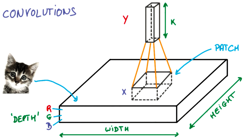 卷积神经网络(Convolutional Neural Networks)是一种在空间上共享参数的神经网络。使用数层卷积,而不是数层的矩阵相乘。在图像的处理过程中,每一张图片都可以看成一张“薄饼”,其中包括了图片的高度、宽度和深度(即颜色,用RGB表示)。
