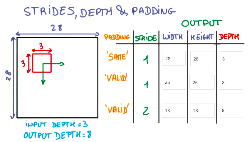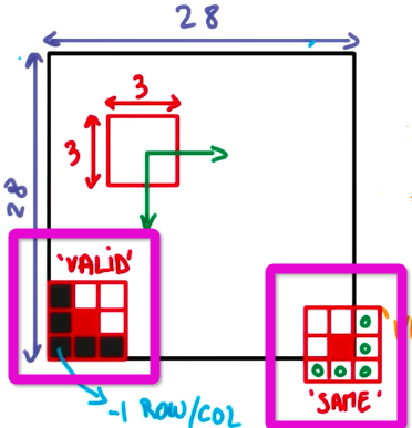 下图展示了以3x3的网格在28x28的图像上,使用不同步长、填充方法填充所得到的输出图像的尺寸: