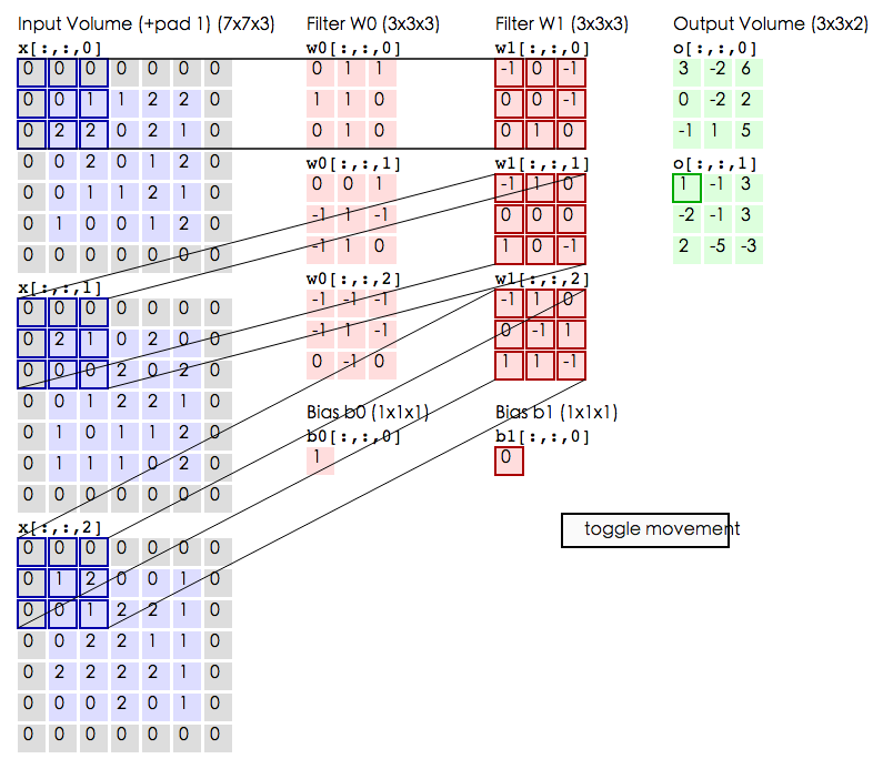 第二种是使用3x3的网格在5x5图像上进行相同填充的卷积过程,动图在:http://cs231n.github.io/convolutional-networks/