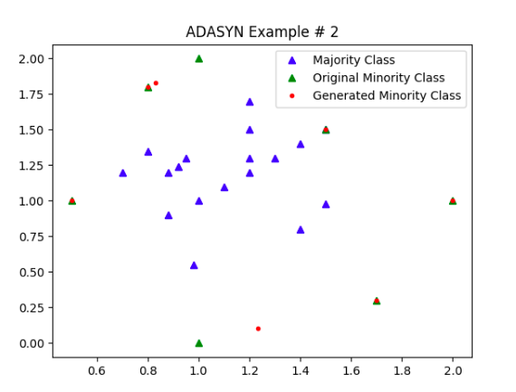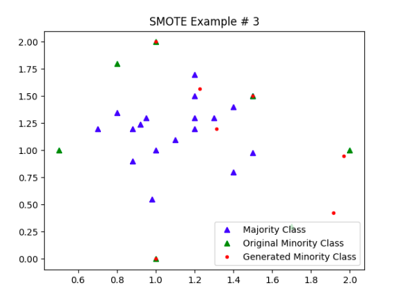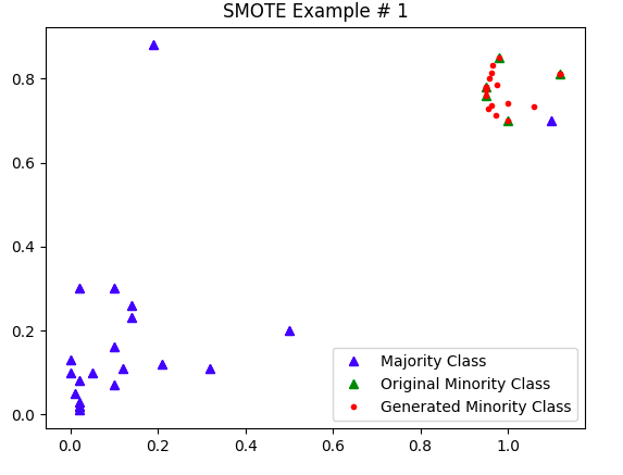 我可视化了一下结果:比如说在下图中,蓝色三角形代表的是多数样本(不妨设为正例),绿色三角形代表的是原始的少数样本(不妨设为反例),而红色圆点则是使用SMOTE算法生成的反例。