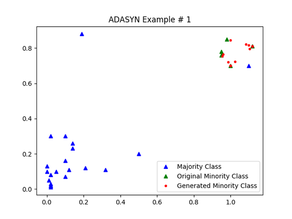但ADASYN也不是完美无缺的——当分割两个类别样本能够清晰地被划分而且数据点间隔很大时ADASYN会出现NaN。例如在以下的情况,ADASYN就很可能会出问题: