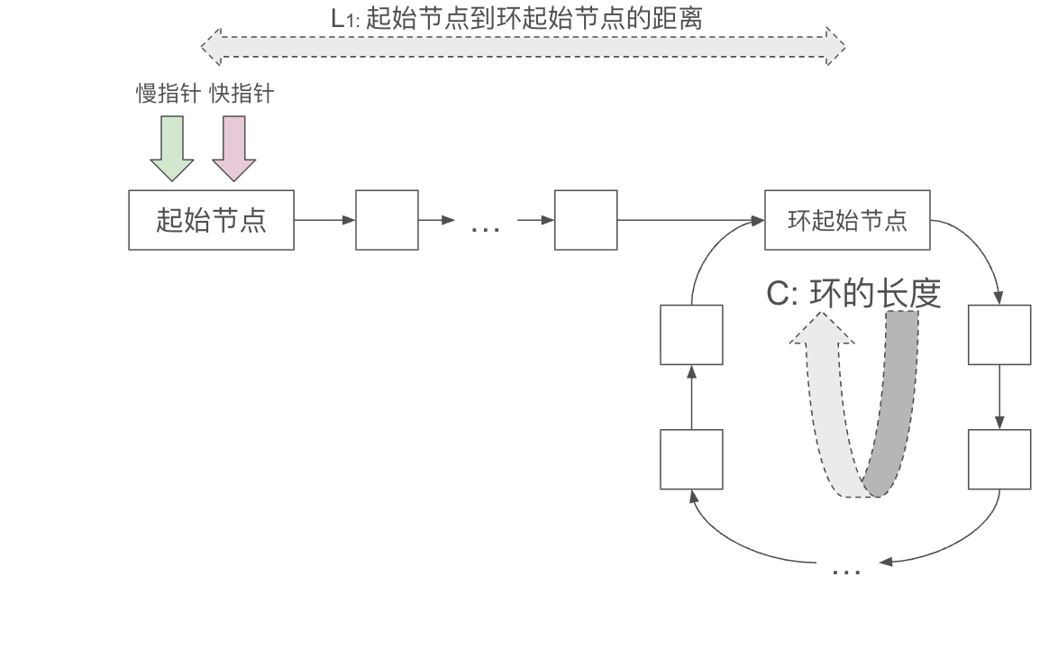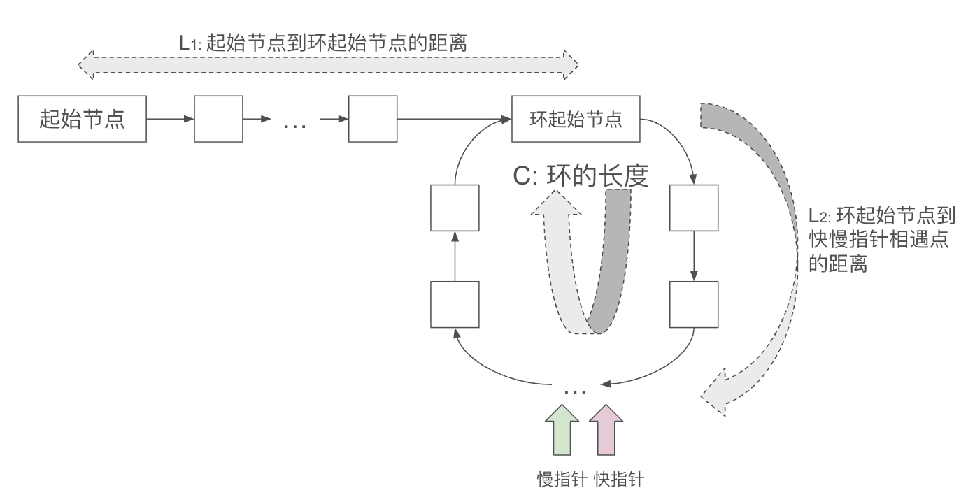 而右边的 $C-L_2$ 也正是慢指针在环内想要再次到达环起始节点所需要走的距离。
